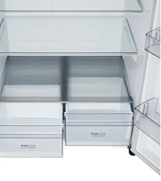 Com 425 litros no frigorífico e 184 litros no congelador, oferece espaço amplo para famílias grandes, com prateleiras ajustáveis, zona fresca, prateleiras de porta e tabuleiro de gelo amovível.
