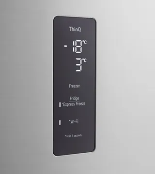 A conetividade Wi-Fi permite controlar o frigorífico à distância, ajustar definições e receber diagnósticos através da app LG ThinQ™, tornando o uso diário mais conveniente.